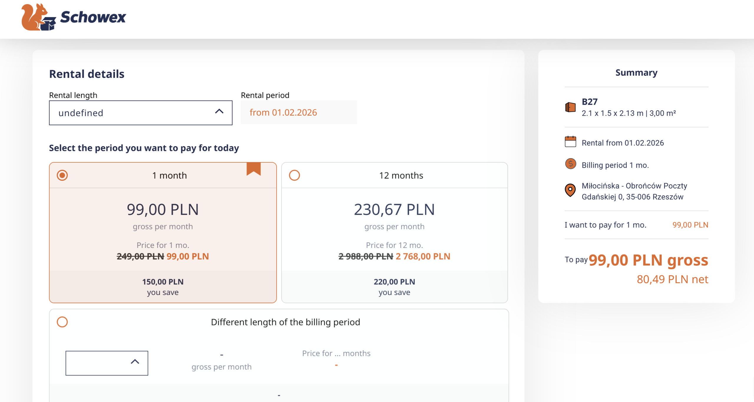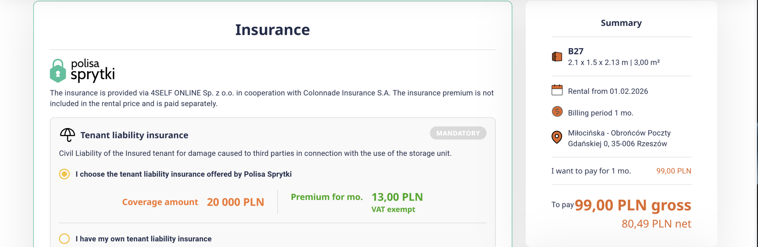 Storage available from 1 month up to several months. Instead of a deposit, third-party liability insurance (TPL) of 13 PLN is automatically charged during the rental, with the option to also insure your belongings.
